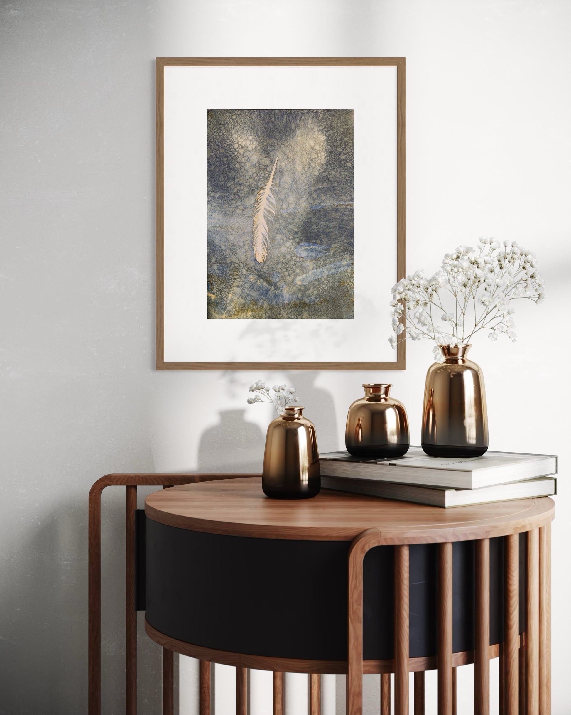 Ik ben echt verliefd op het resultaat dat veren in combinatie met de natte cyanotype techniek geven. Soms is zelfs de blauwe kleur zo goed als verdwenen en heeft plaatsgemaakt voor een spannend kleurenspel waarin de veer de hoofdrol blijft spelen.