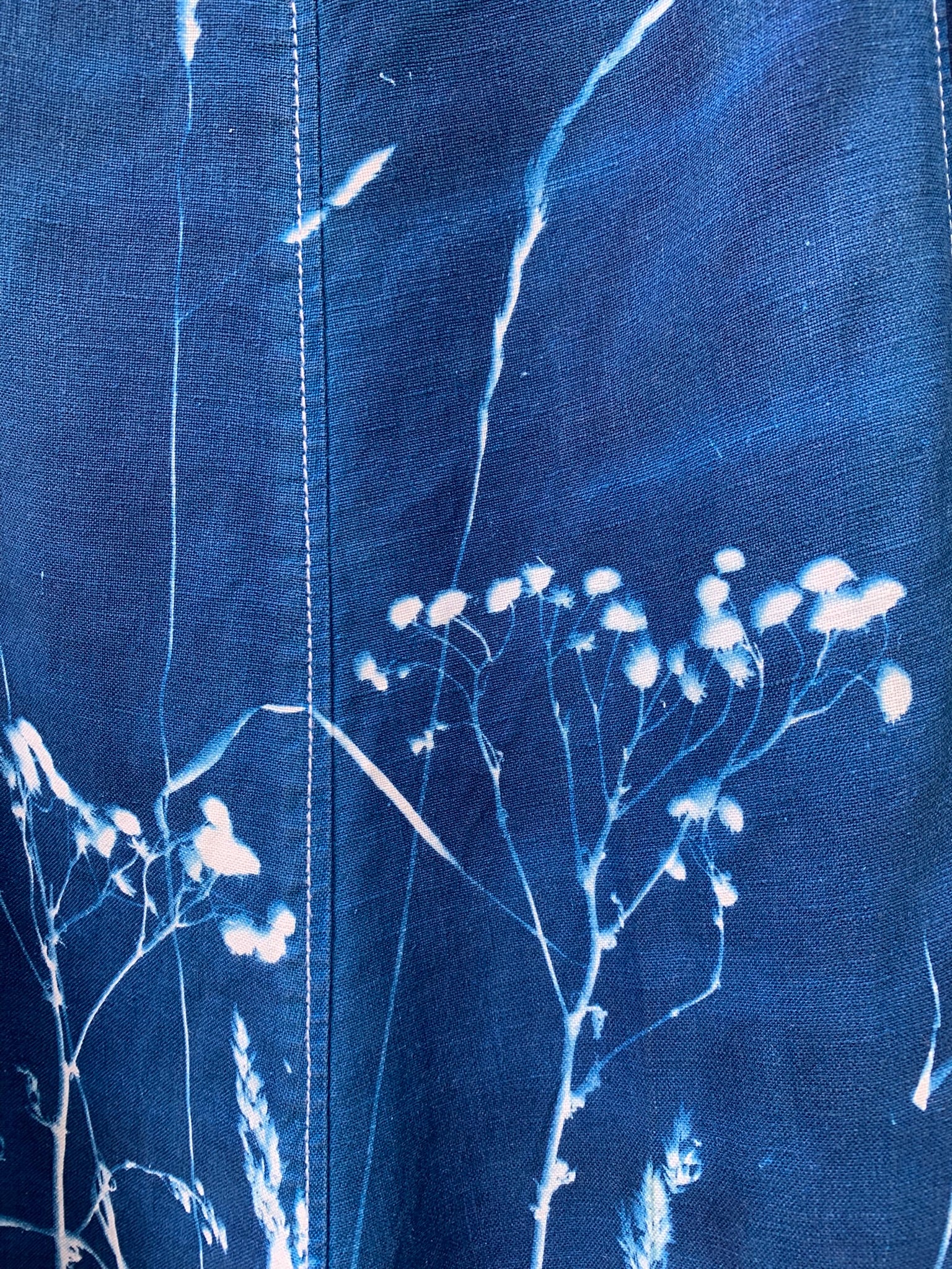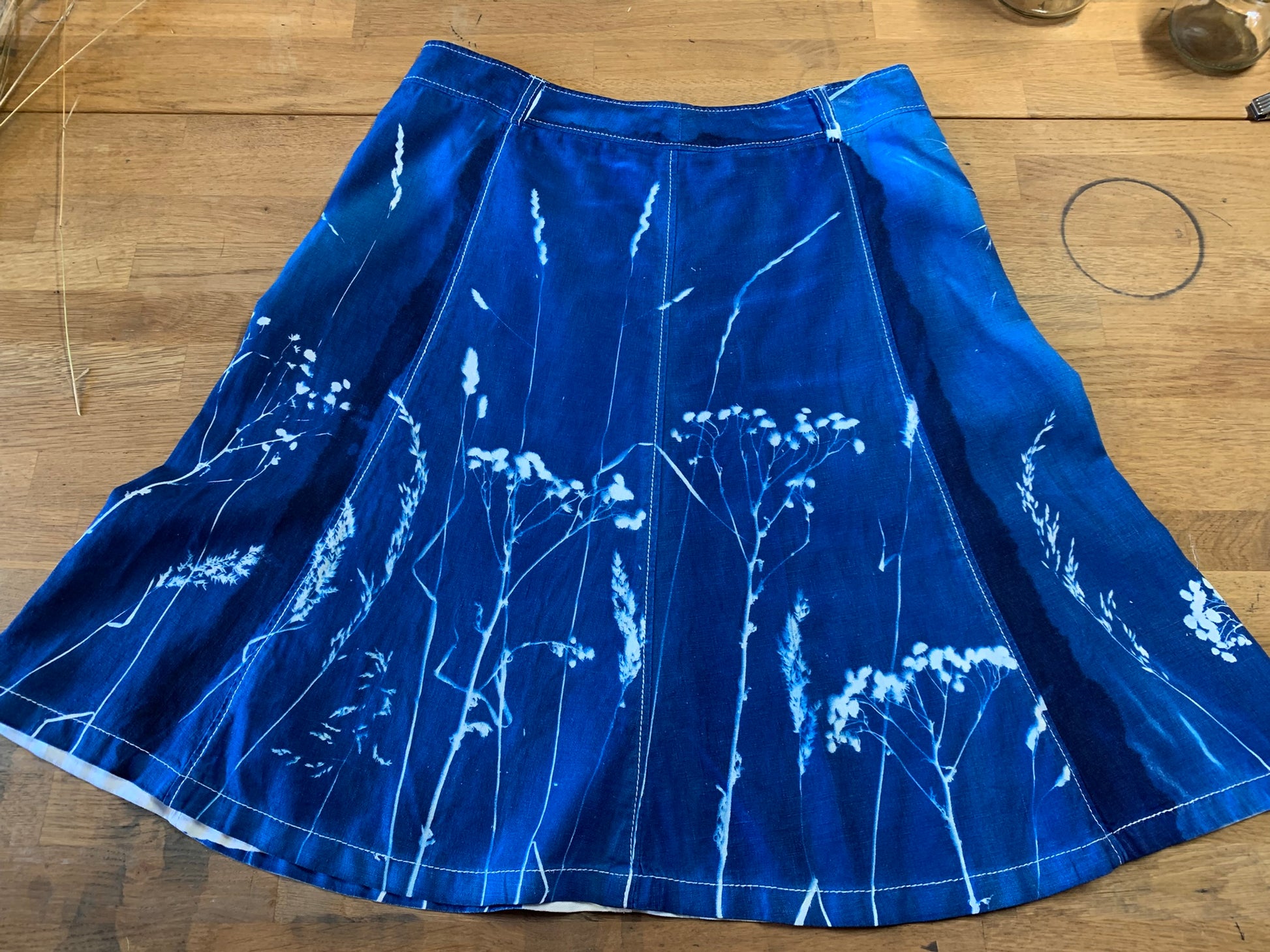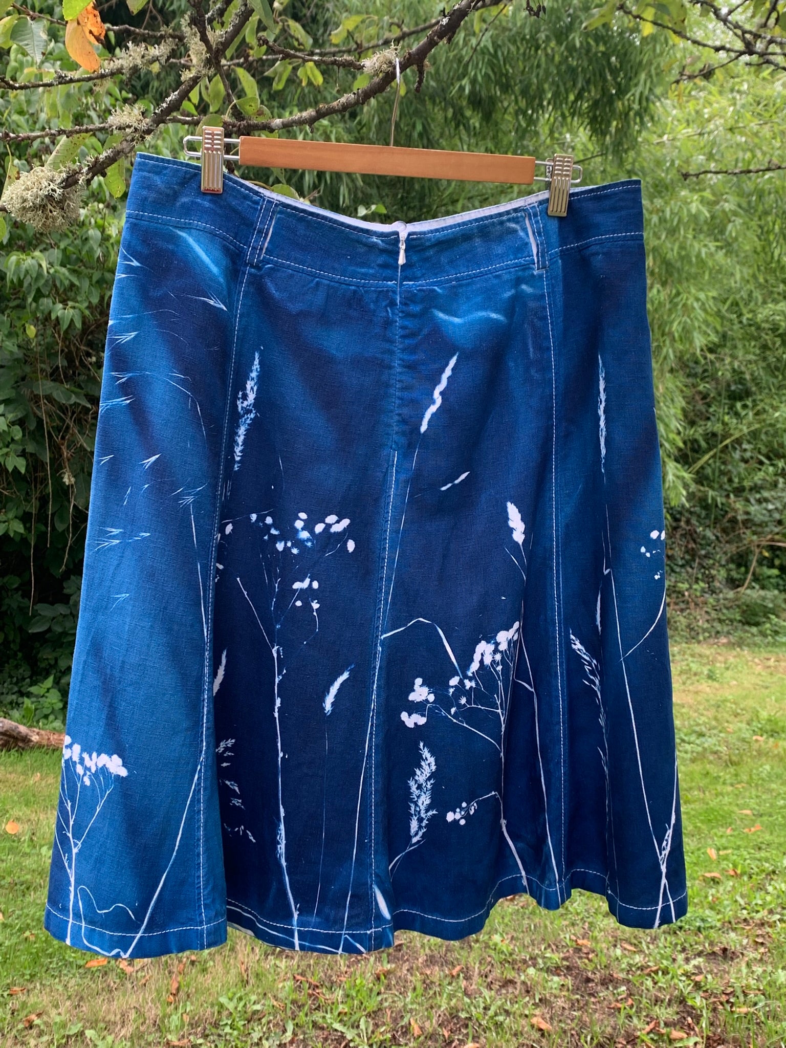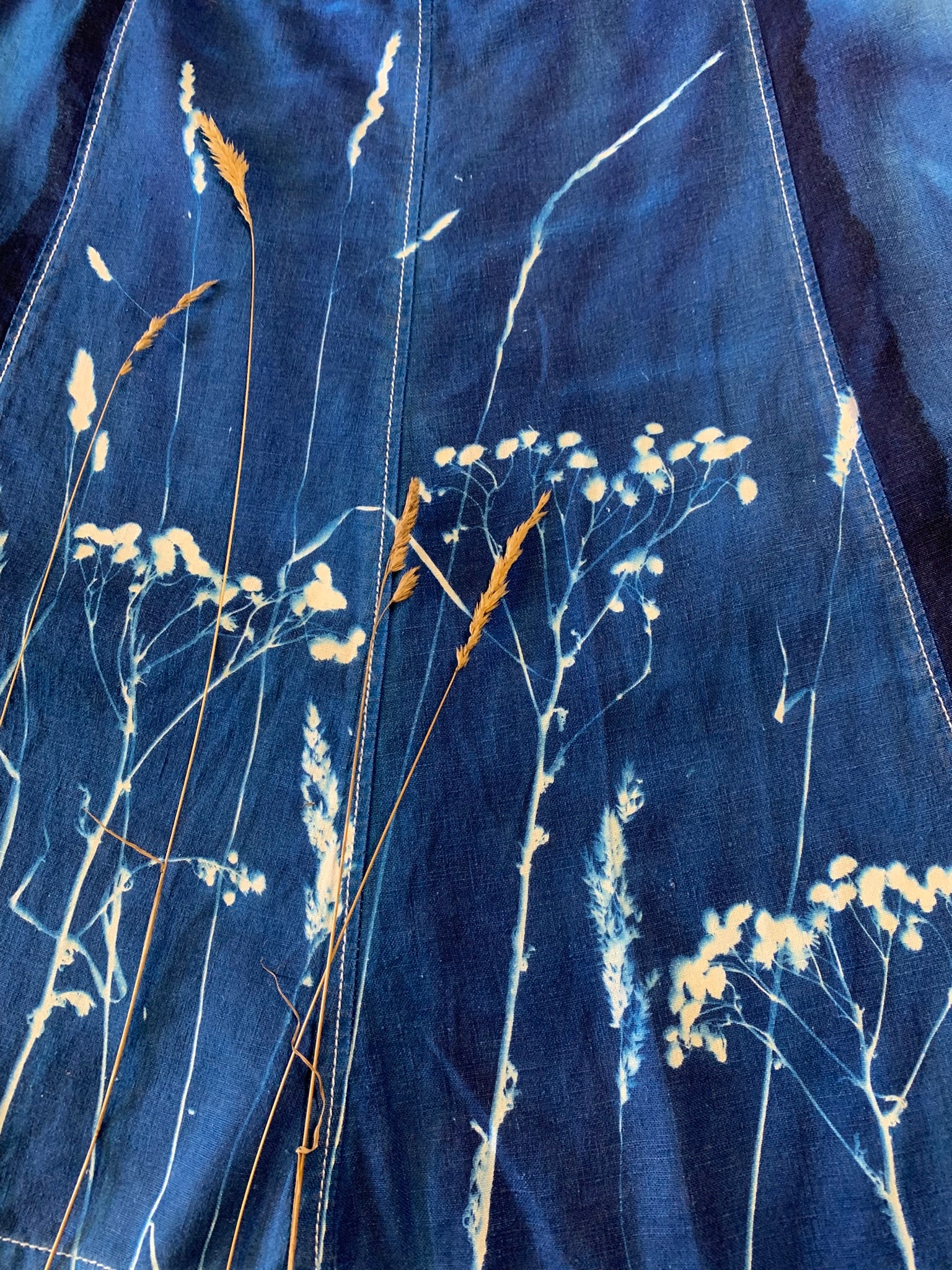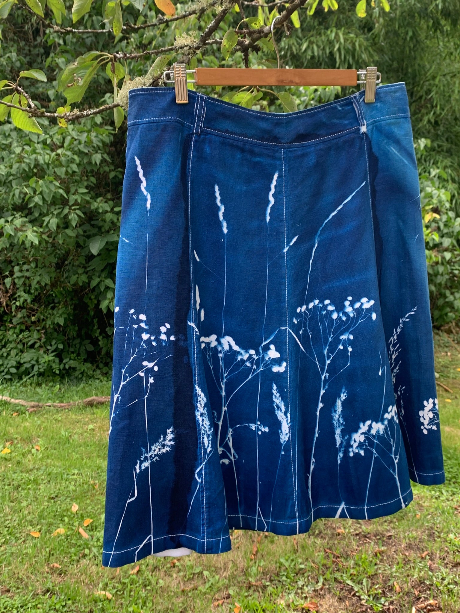 Van origine een 'saaie' wit linnen rok. Met de blauwdruk techniek omgetoverd tot een sprankelend blauwe rok gedecoreerd met zomerse grassen uit de Morvan.