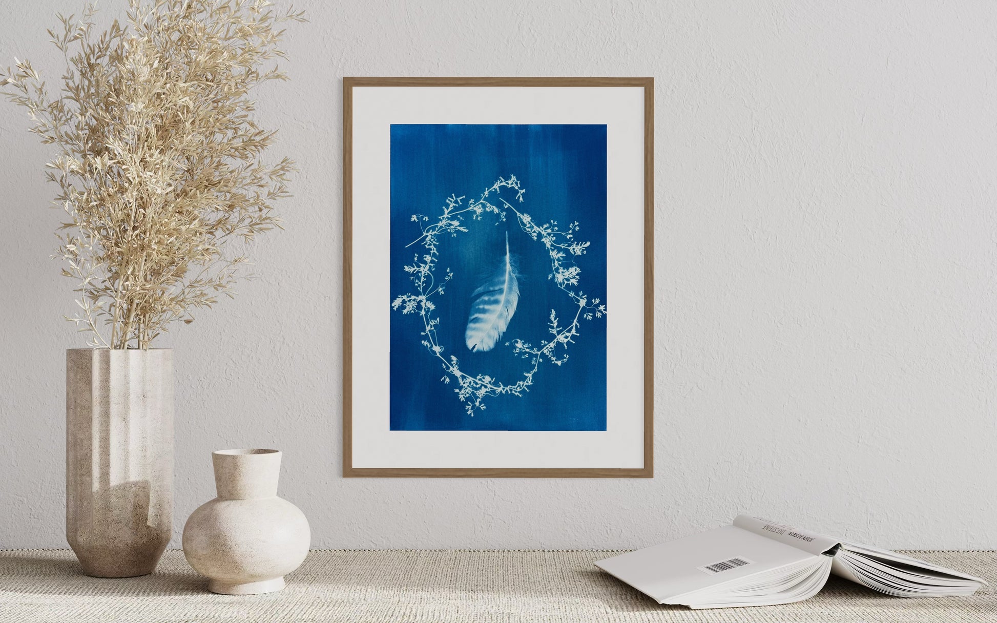 Originele blauwdruk 'Beschermd' met een gevonden veer van buizerd, omringd door wilde bloemen.