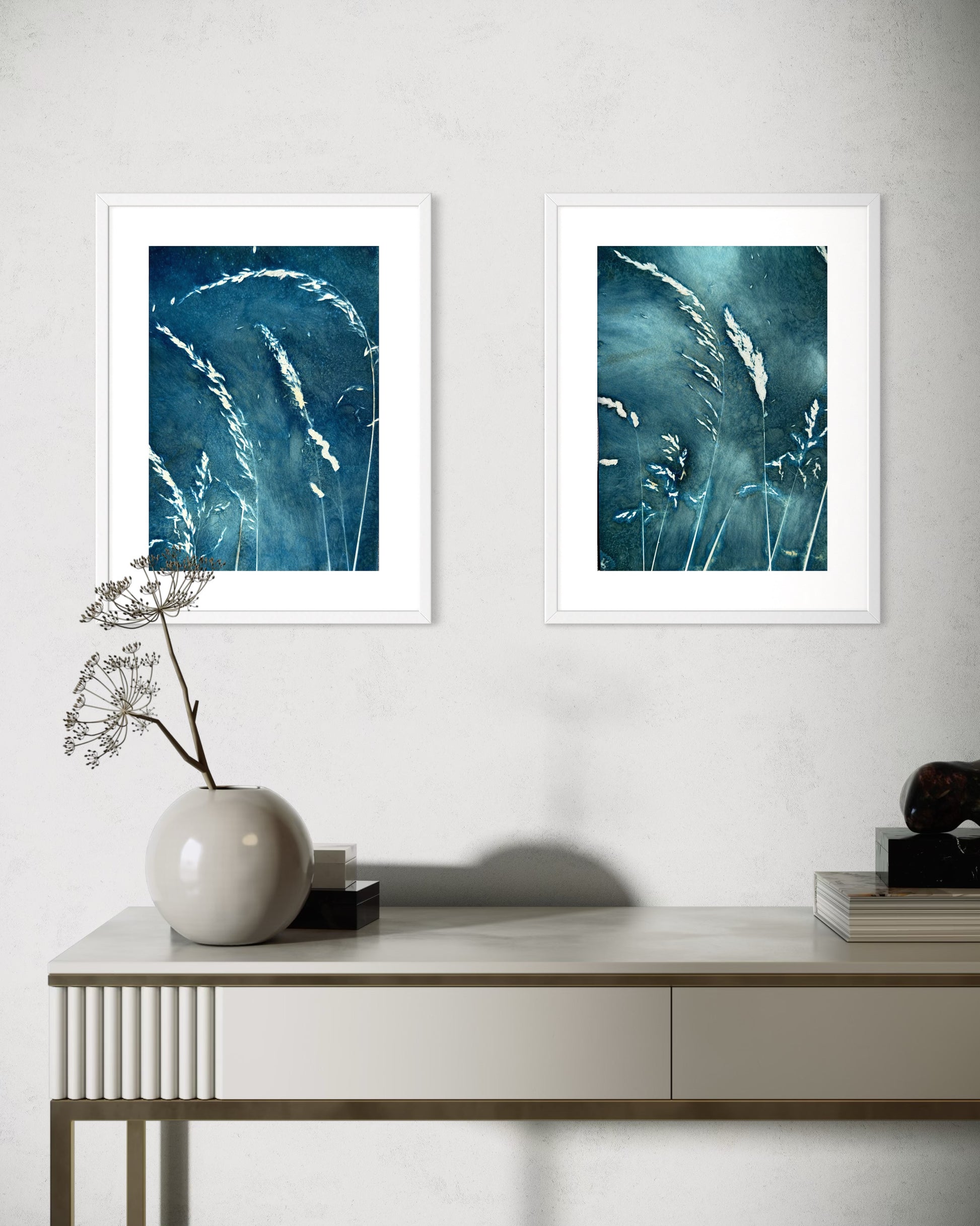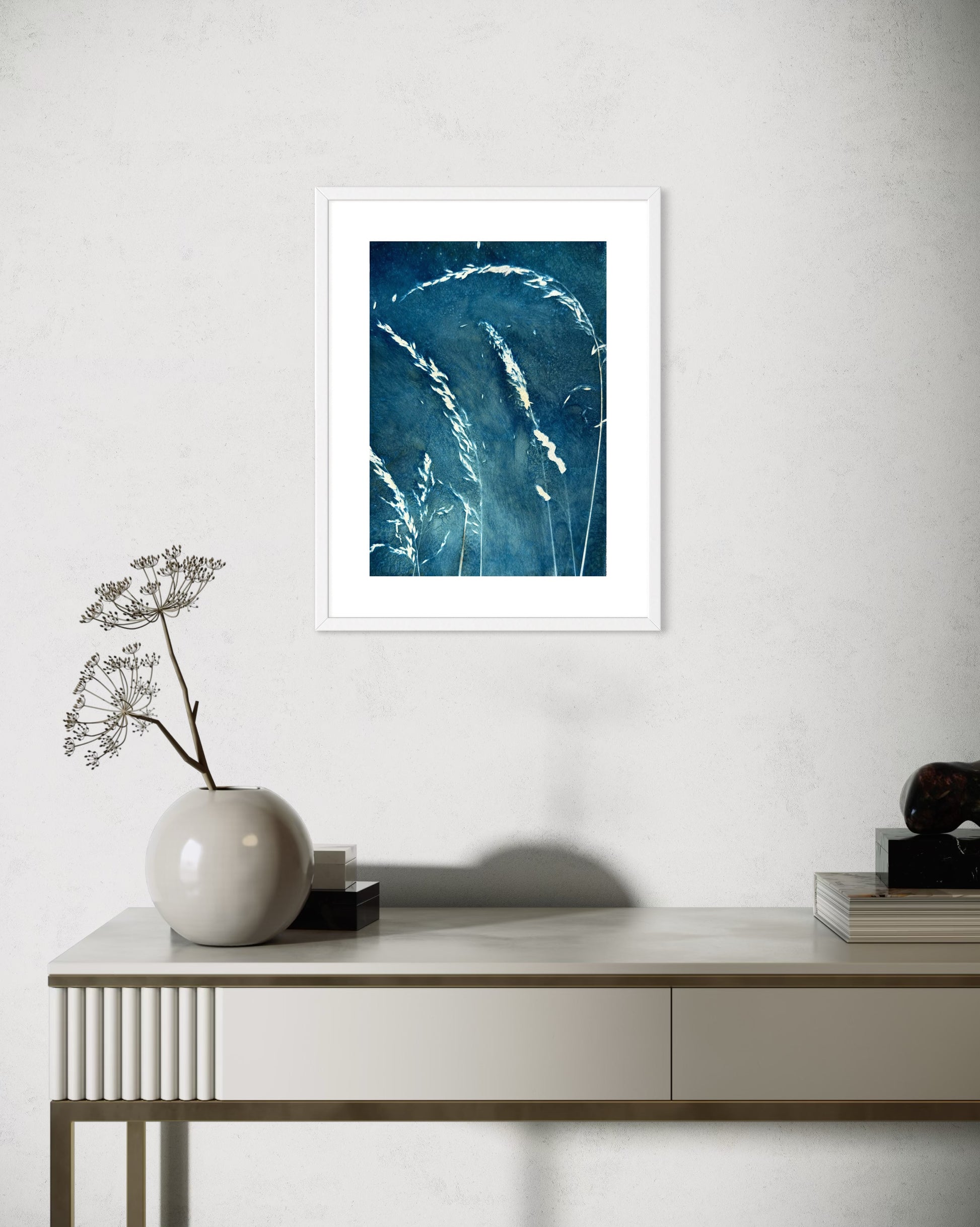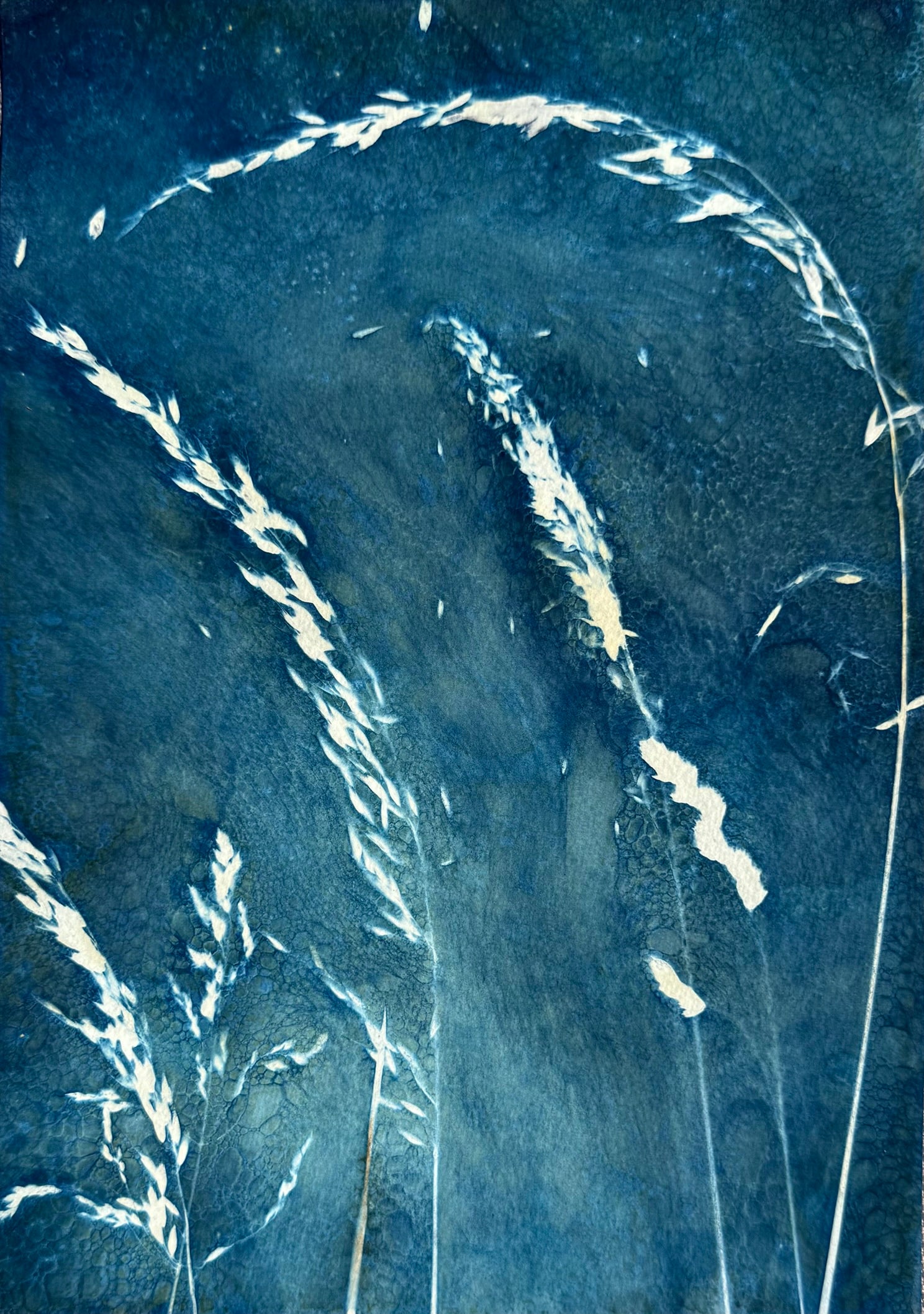 Originele, unieke 'natte' blauwdruk print met wilde grassen uit de Morvan